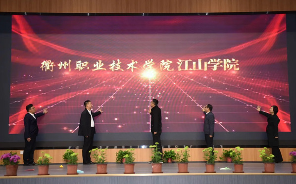 校党委委员、副校长姚水洪,衢州市教育局高职成教处处长吴小伟,江山市政府办公室副主任高见,江山市教育局党委委员、副局长王以洪,衢州第二中等专业学校校长吴晓彩共同为江山门业定制家居产业学院揭牌。