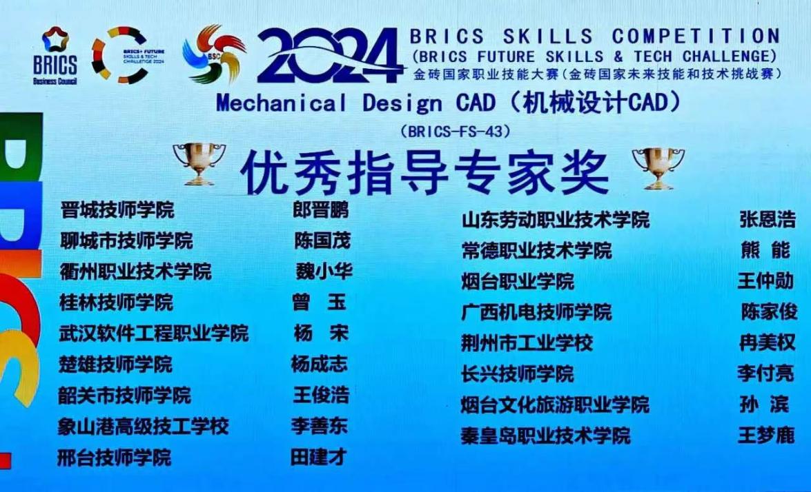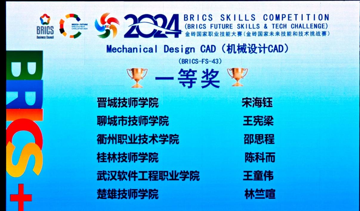 近日,2024金砖国家职业技能大赛(金砖国家未来技能和技术挑战赛)机械设计CAD赛项国际总决赛圆满落幕。机电工程学院邵思程老师凭借出色表现荣获该赛项一等奖,指导教师魏小华被授予优秀指导专家称号。
