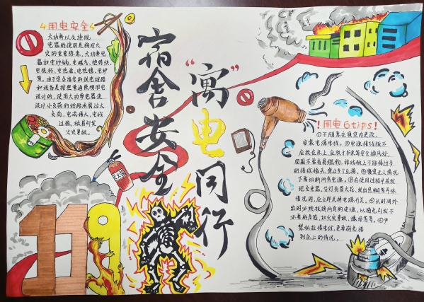 活动邀请同学们围绕学生公寓安全的多个方面展开创作。在创作过程中,同学们尽情挥洒创意,运用了彩色铅笔、水彩、剪贴画等多种艺术手法,将原本枯燥的安全知识转化为一幅幅色彩斑斓、生动有趣的手抄报。有的作品以消防安全为主题,通过生动的火灾逃生场景描绘,提醒同学们时刻保持警惕;有的作品则聚焦于用电安全,用形象直观的漫画形式展示了正确用电的重要性;还有的作品结合防盗防骗知识,巧妙融入智斗骗子的故事情节,既富有教育意义又引人入胜。