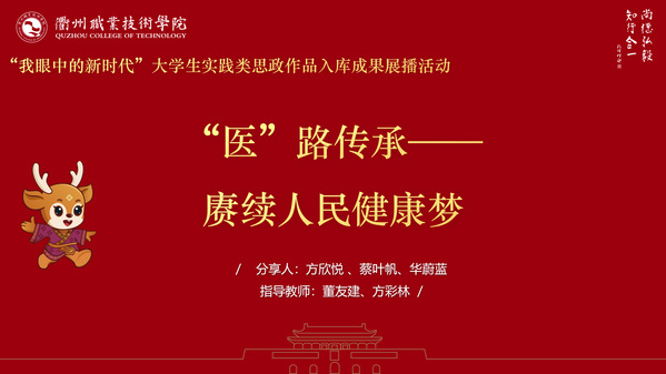 近日,高等教育出版社公布了首届“我眼中的新时代”大学生实践类思政作品入库成果展播活动入围名单。我校选送的视频作品《“医”路传承——赓续人民健康梦》(主讲:方欣悦、蔡叶帆、华蔚蓝;指导教师:董友建、方彩林)从全国76所高校411份参赛作品中脱颖而出,入选优秀作品库。