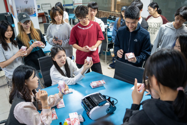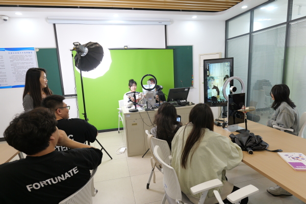 在经济管理学院,经管党员师生为发展对象准备了一场“场景化教学+沉浸式体验”的现场教学盛宴。在财金技能实训室,发展对象通过优秀学生代表指导,沉浸式体验单指单张、多指多张点钞技法,在指尖翻飞中感悟财经工作的严谨规范;在直播电商实训室,实时观摩“直播带货”全流程运作,透过高清绿幕直播间等现代化设备,切身感受数字经济时代产教融合的前沿图景。