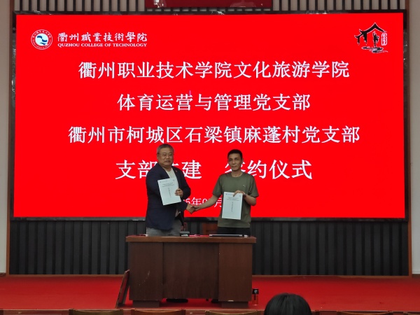 在签约仪式上,体育运营与管理党支部书记陈力全与石梁镇麻蓬村党支部书记傅建军分别代表双方签署党建联建协议,校党委委员、组织部长周帅授牌,标志着校地双方正式“牵手”,开启深度合作新征程。