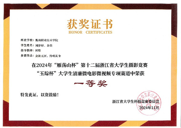 本届大赛于2024年8月启动,以“光影@廉映于心”为主题,其中高校赛区共收到128所高校的724部作品。浙江省内高校赛区作品通过浙江省大学生摄影竞赛专项赛通道选拔,晋级国赛,竞争异常激烈。在校纪委悉心指导下,艺术设计学院何敬老师带领学生团队深入挖掘清廉内核,紧密结合高校特点,以创新思维打磨作品。周梦婷、余佳创作的《贪欲无厌,终噬其身》与张艺婕、程筠淇、刘一磊创作的《缚心》,在第十二届浙江省大学生摄影竞赛“玉琮杯”大学生清廉微电影微视频专项赛中,分别荣获一等奖、三等奖,成功晋级国赛。其中,《贪欲无厌,终噬其身》凭借深刻的主题立意、精湛的镜头语言,在众多优秀作品中突出重围,最终斩获全国高校赛区铜奖。