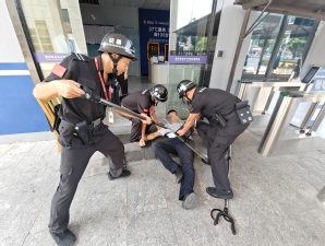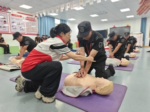 7月17日上午,一场“不打招呼”的反恐防暴演练在西门骤然打响:一名“可疑人员”持刀试图翻越强行闯入校园,值班安保人员第一时间触发一键报警,3分钟内,巡逻人员携带防暴钢叉、盾牌迅速集结形成包围圈,最终“可疑人员”被制服移交警方。除了“对抗式”演练,技能培训同样“干货满满”。市巡特警支队教导员通过“情景模拟+动作分解”,手把手教授安保人员如何利用防暴器械形成“三角阵型”控制局面;智慧新城消防救援大队教官现场教授消防设备使用,演示灭火器“提、拔、握、压”四步操作法,并组织参训人员用模拟火源反复练习;医学院相关老师则开展了心肺复苏等技能培训。