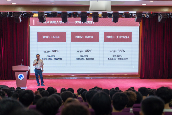 魏小华紧接着发表演讲,他通过分享校企合作的成功案例,详细阐释了学院“产教融合”的教学理念;同时介绍了学院优质的师资力量与先进的专业教学设备,鼓励新生们积极参与各类学科竞赛与技能比拼,争取在实践中锤炼能力、取得优异成绩。