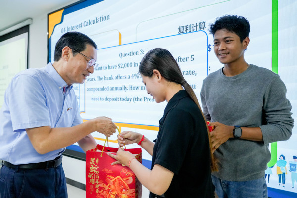 徐须实将学校精心准备的中秋礼盒送到每一位柬埔寨学生手中。柬埔寨同学们连连用中文表达感谢,这份独具地方特色的心意,让他们不仅感受到了中秋的团圆意,也体会到了第二故乡的风物情。